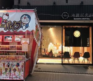 大森・鷲神社の通りに面した池田屋歯科の前にもたくさんの屋台が並んで